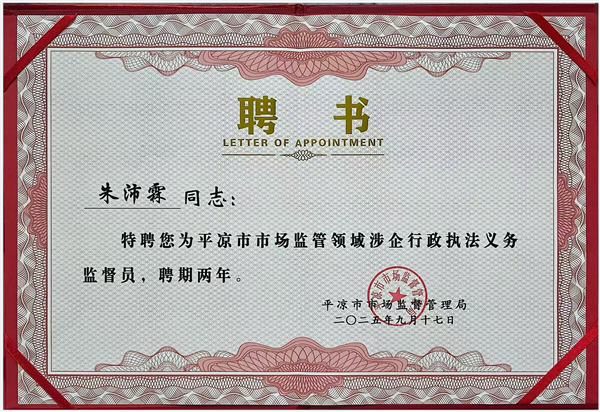 2025年9月被平?jīng)鍪袪I商環(huán)境建設(shè)局聘請為“平?jīng)鍪袪I商環(huán)境特約監(jiān)督員”“平?jīng)鍪惺袌霰O(jiān)管領(lǐng)域涉企行政執(zhí)法義務(wù)監(jiān)督員”。